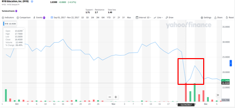 我们来看看当时红黄蓝的股市发生了什么,美国22号早上,当日红黄蓝的股票(RYB)高开低收,只是下跌了4%。但是由于事件严重,23号RYB停市,美国时间24号恢复交易,当天股价裂口暴跌42%,仅仅在10天的时间里,红黄蓝的股价从14号的最高点$30块钱跌到了历史新低$16.4,股价破发。之前看好并持有红黄蓝股票的投资者无一例外全部被套,又由于舆论的压力大部分的投资者不但被套还被迫割肉出场。