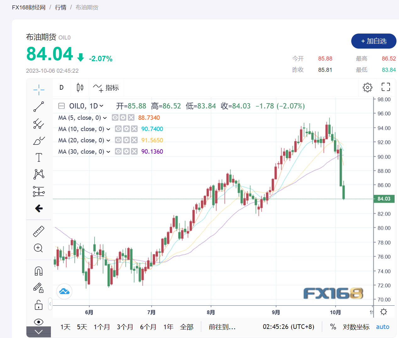 截至发稿,布伦特原油期货现报84.04美元/桶,跌幅达2.0%(或1.78)。