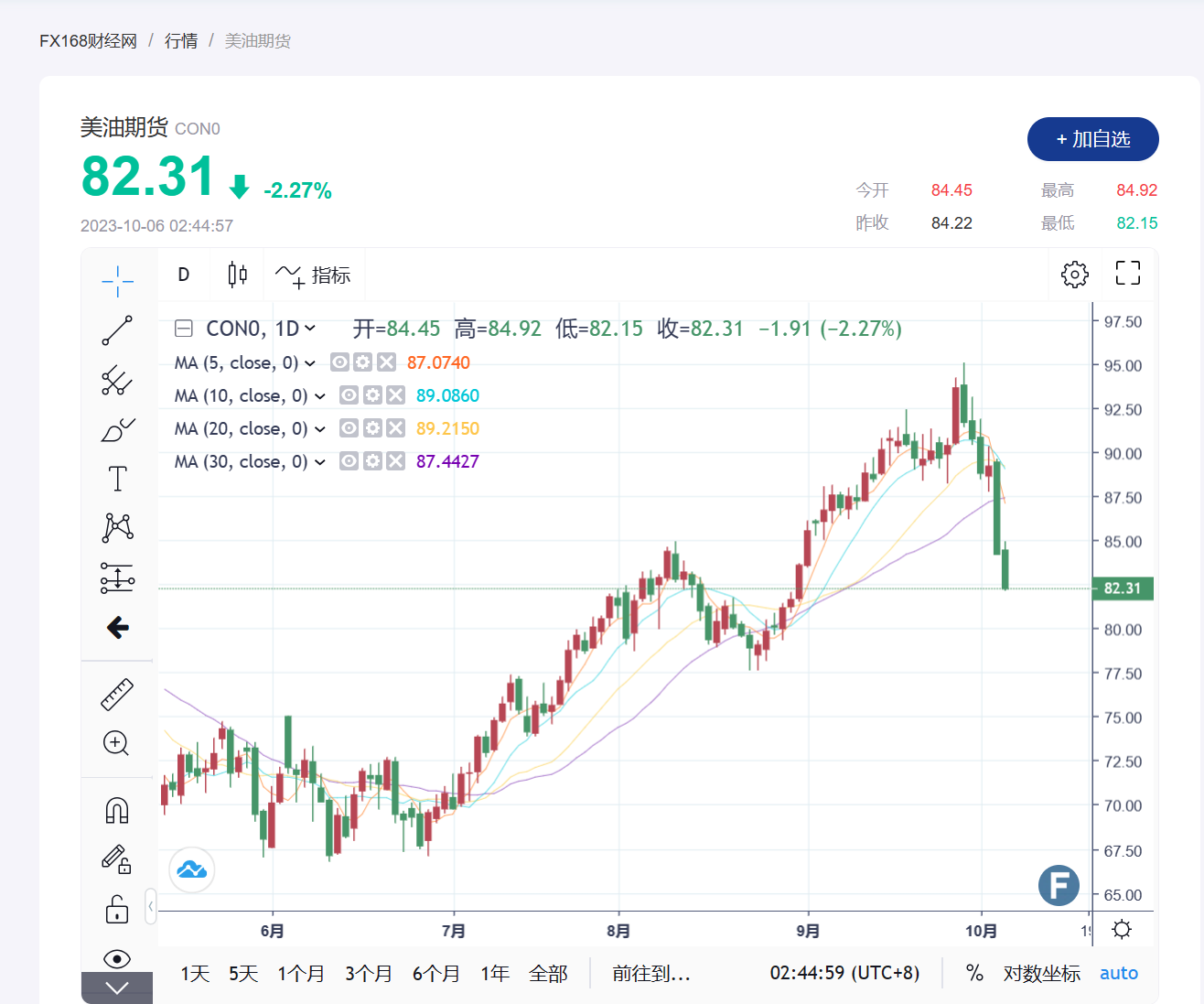 WTI 11月原油期货结算价收跌2.27%,收报82.31美元/桶。