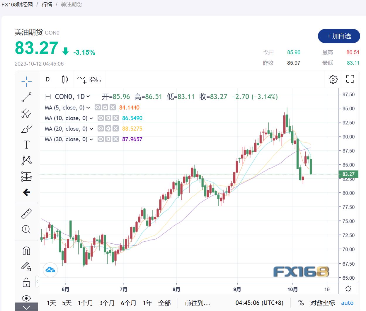由于投资者关注巴以冲突的进一步发展,纽约商业交易所 (NYMEX) 西德克萨斯中质原油 (WTI) 期货仍在 83~85 美元/桶左右波动。