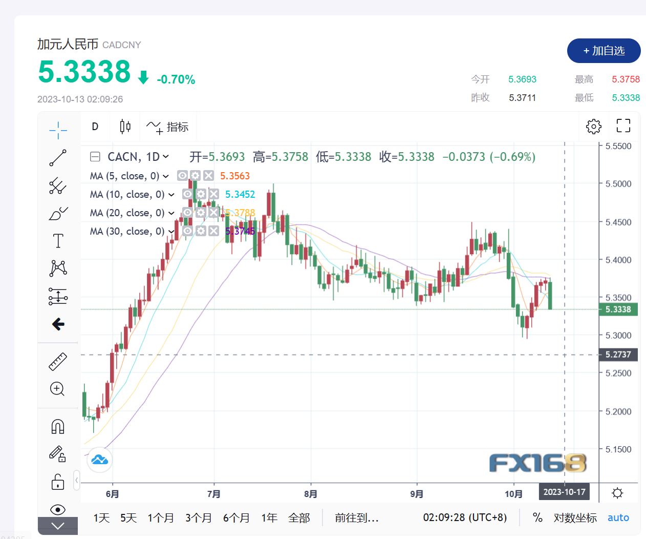 (加元/人民币汇率走势图,来源:FX168)