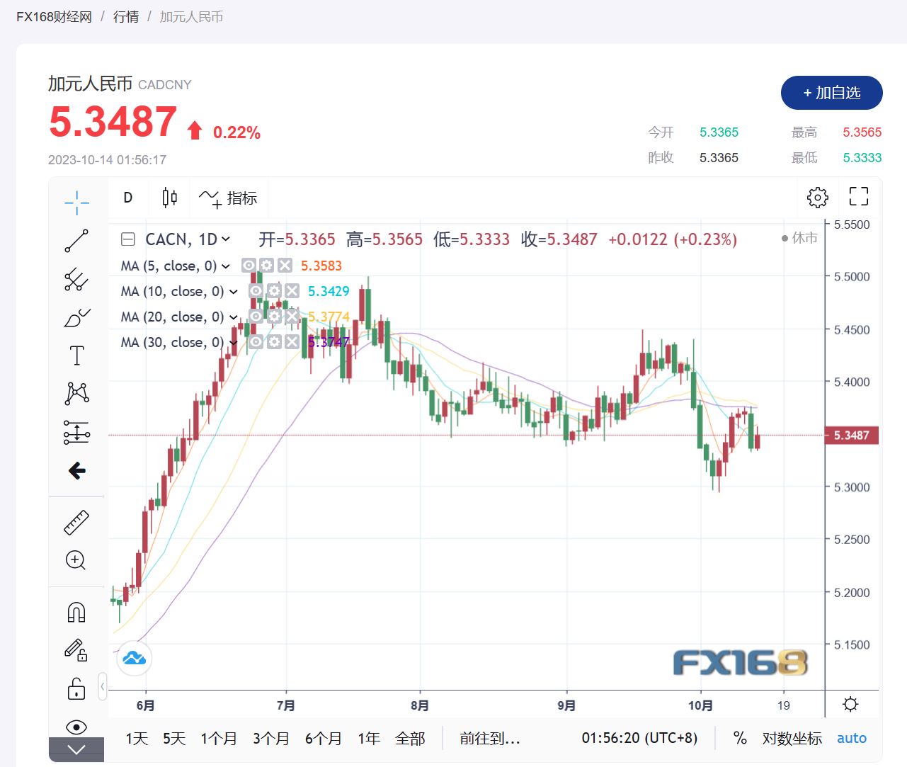 加元/人民币扭转昨日跌势,低位反弹,现报5.3487,涨幅为0.22%。