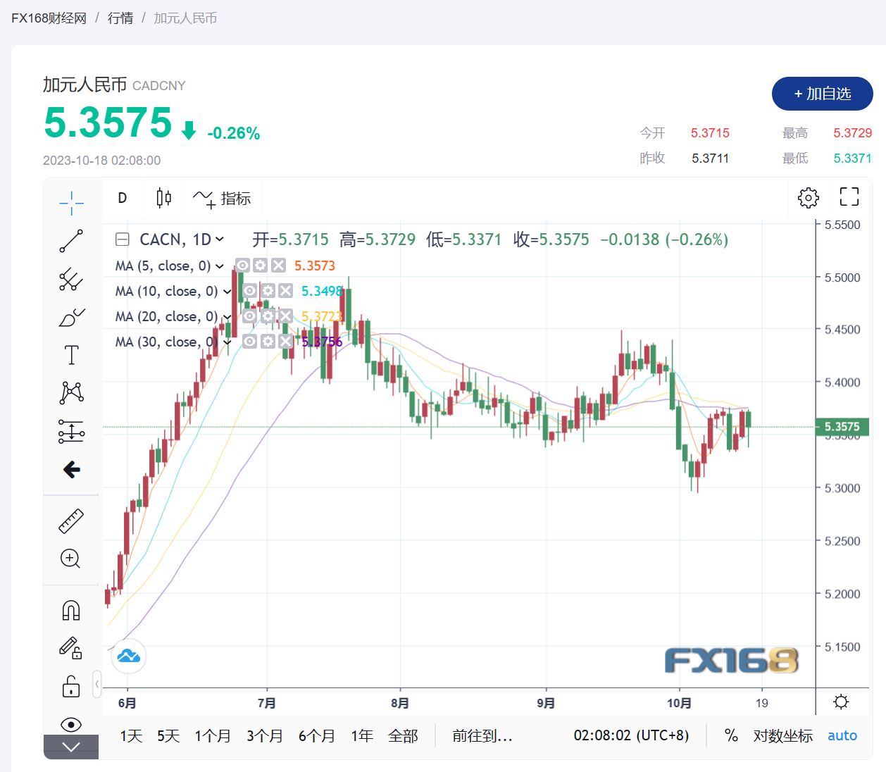 加元/人民币随着加元兑一揽子货币汇率下跌影响出现跌幅,现报5.3575,跌幅为0.26%。
