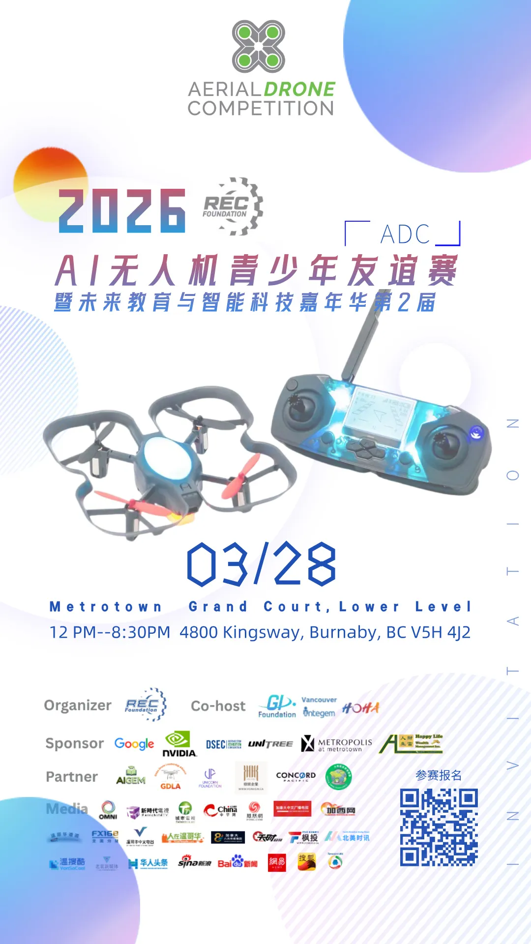 2026年3月28日,REC‑AI 无人机青少年友谊赛(ADC)暨未来教育与智能科技嘉年华第二届,在加拿大 BC 省最大的大的商场Metrotown盛大举办。本次活动由GI Foundation、Vancouver Integem、HOHA Creative 联合主办,财富人生财富管理有限公司荣誉赞助支持。本次活动吸引了各界嘉宾与机构参与,来自不同学校与机构的青少年选手、教育专家、政府代表及业界嘉宾,共同见证这一科技与教育的盛事。