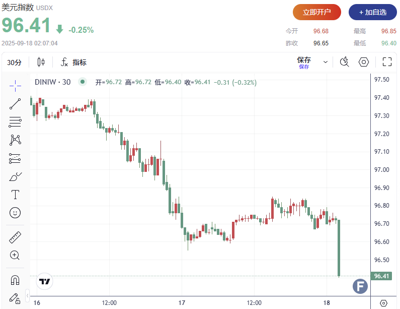 美联储决议公布后,美元指数短线跳水27点,现报96.41。