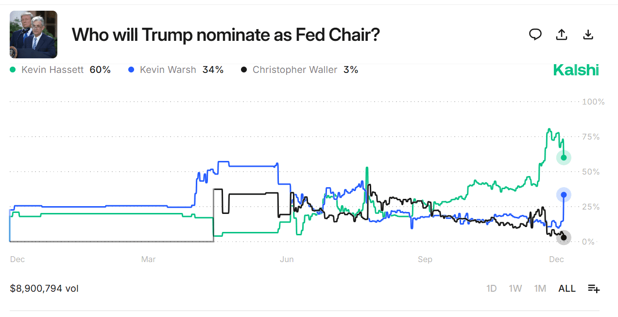 在《华尔街日报》报道发布后,预测市场随之出现变化。预测平台Kalshi的数据显示,沃什获得提名的概率从此的前约15%一度飙升至最高40%。与此同时,哈塞特出任下一任美联储主席的隐含概率则从不久前的80%短暂跌破60%。