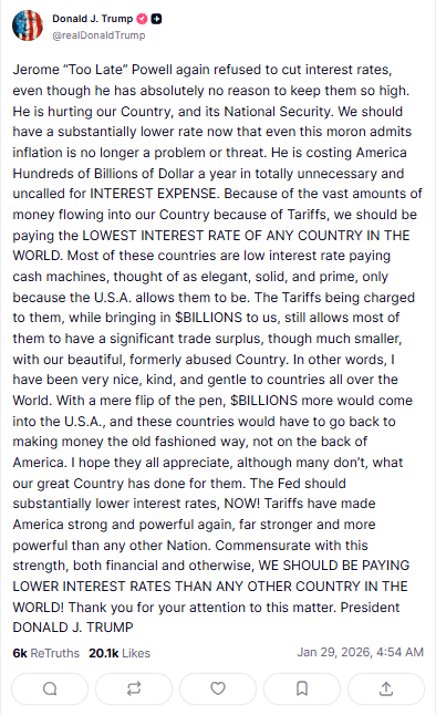 此次抨击发生在美联储2026年首次议息会议之后。尽管白宫方面持续施压要求降息,美联储仍决定维持借贷成本不变。目前基准利率区间维持在3.5%至3.75%。