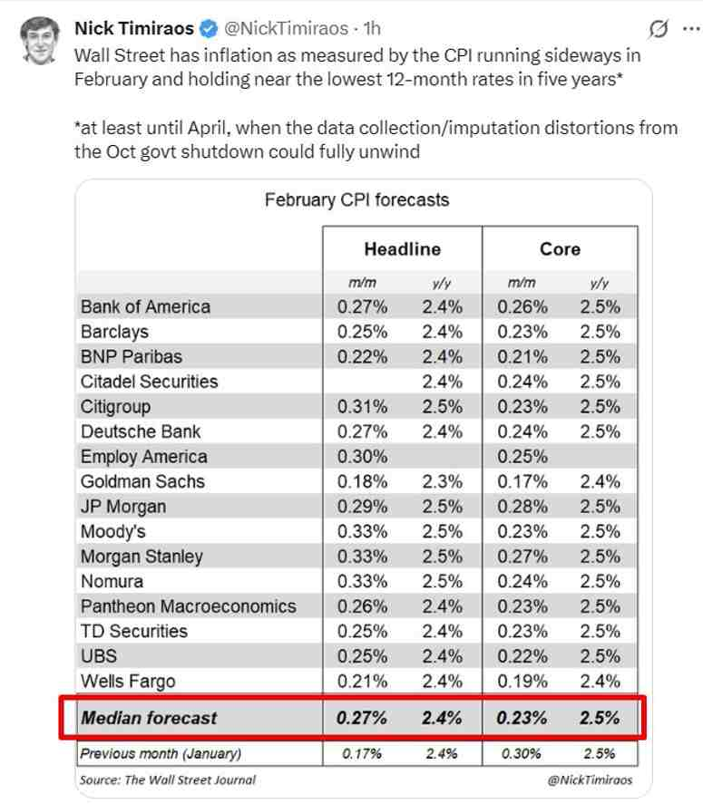 本周来看,CPI数据将于 2026 年 3 月 11 日(周三)美国东部时间上午 8:30 发布。据华尔街日报预测,整体CPI预计同比增长2.5%,环比或增长0.27%。剔除食品和能源价格的核心CPI预计同比增长2.5%,环比或增长0.23%。
