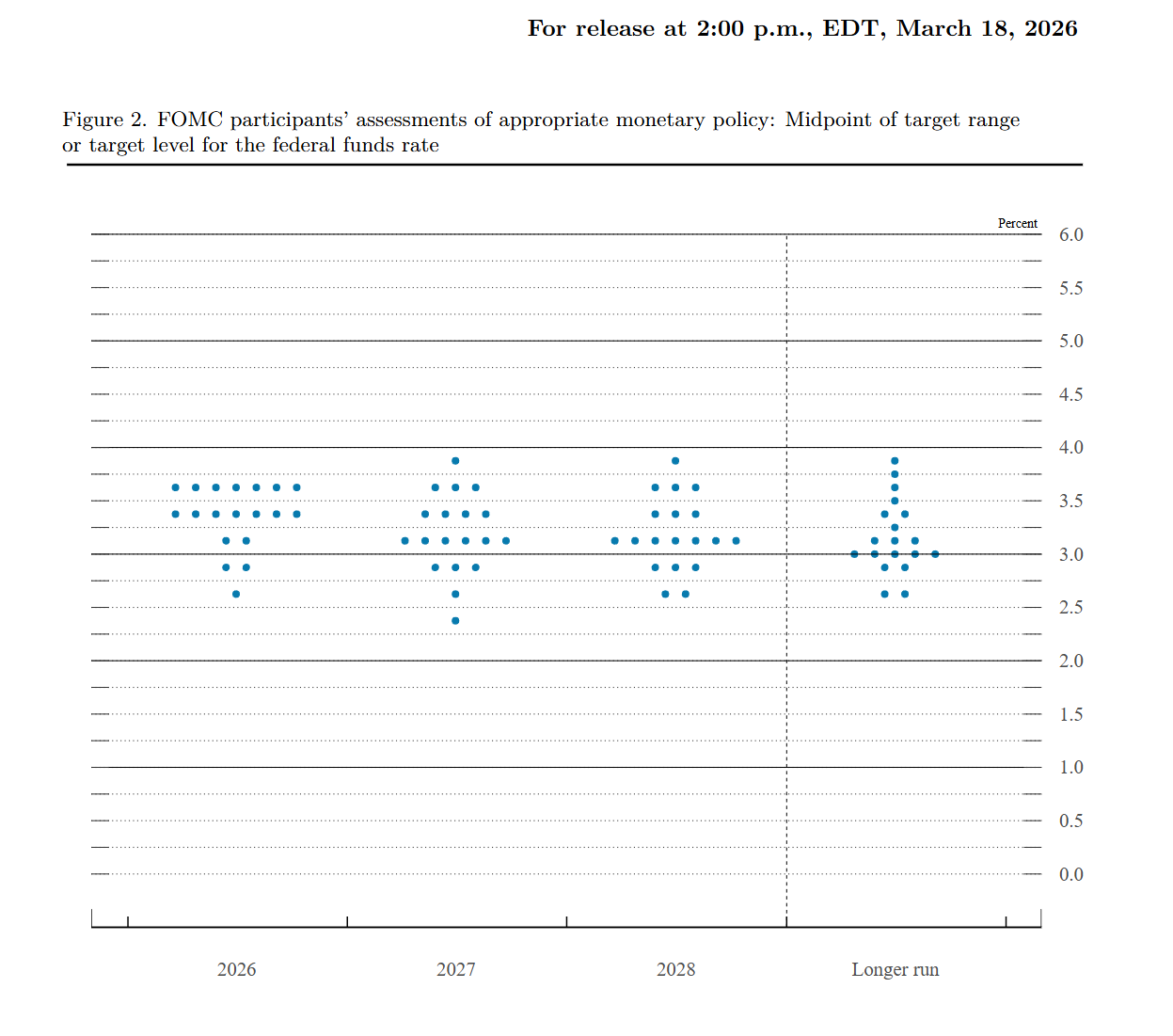 尽管不确定性加剧,官员们仍再次暗示未来可能会有降息。备受关注的“点阵图”显示,官员们预计今年将有一次降息,2027年还将再降一次,但具体时点仍不明确。