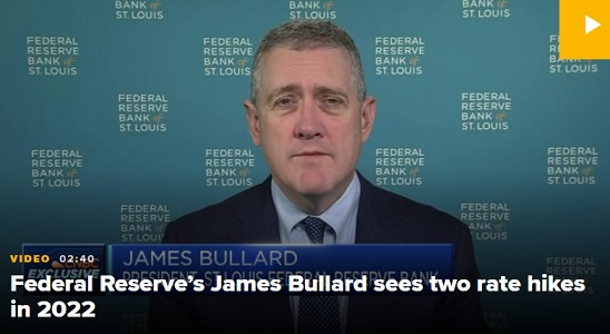 布拉德说道:“基于我认为我们现在的状况,我实际上预计在2022年加息两次……在我们进入明年上半年的时候,这种情况可能会发生改变。”