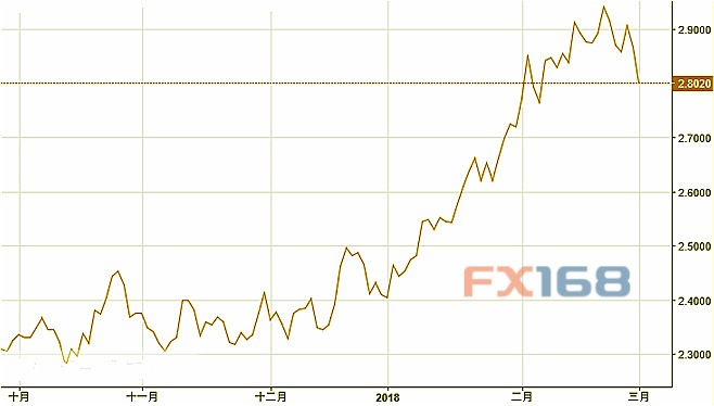 受到美国总统特朗普表明会对进口钢铁及铝征收关税,触发股市下跌及资金流入债市避险,美国国债价格周四回升,债息回落。其中,两年期债券息率跌5.6点子报2.206厘;十年期债券息率跌6.7点子报2.802厘;三十年期债券息率跌4.6点子报3.084厘。