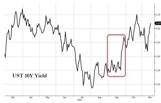 正如金融博客zero hedge撰文指出,外国央行已经连续5个月抛售美国国债,且值得提醒的是,美国国债收益率在9月份飙升,股市暴跌——如下图所示,最新的9月TIC国际资本流动数据显示,当时美债收益率大幅攀升……