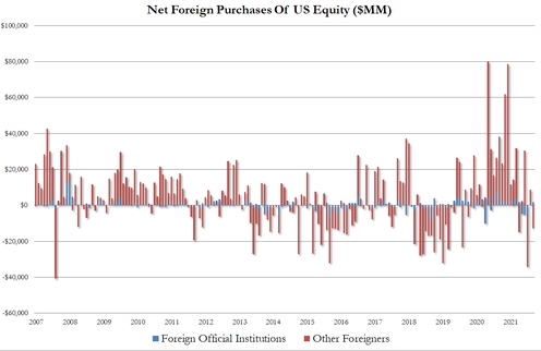 外国人出售美国股票:私人实体出售127亿美元,官方(央行、储备管理机构)账户购买了17亿美元美国股票……