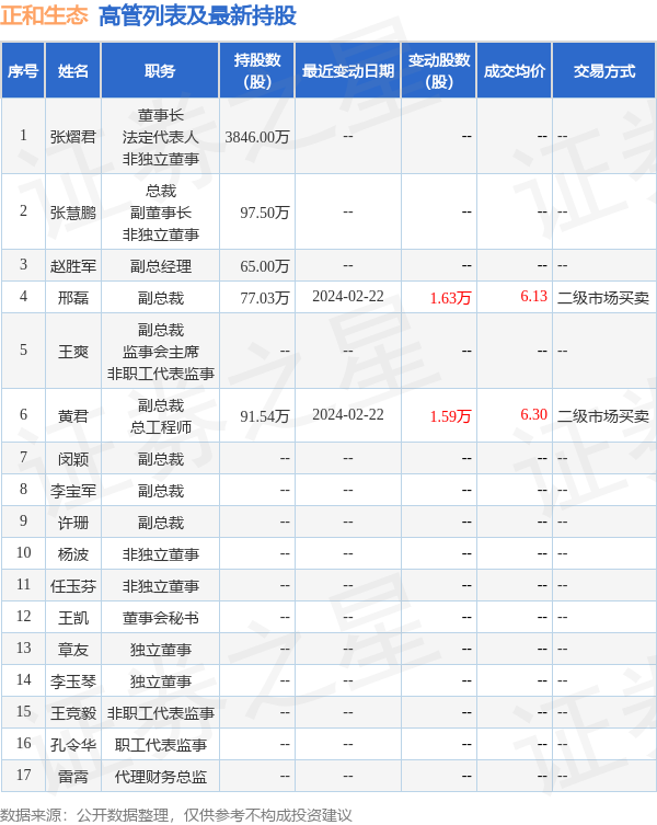 正和生态近半年内的董监高及核心技术人员增减持详情如下: