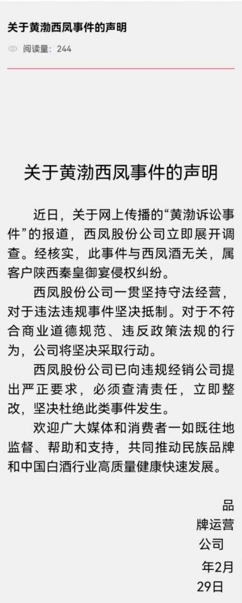 针对此事,2月29日,陕西西凤酒股份有限公司官网发声明作出回应。