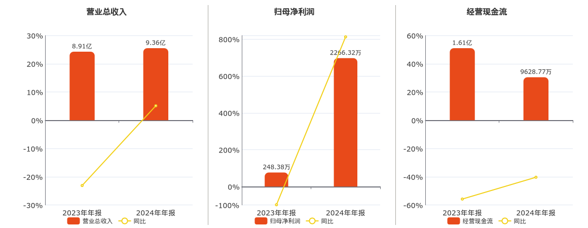 公司营业总收入为9.36亿元。归母净利润为2266.32万元。经营活动现金净流入为9628.77万元,较去年同报告期经营活动现金净流入减少6509.75万元,同比较去年同期下降40.34%。