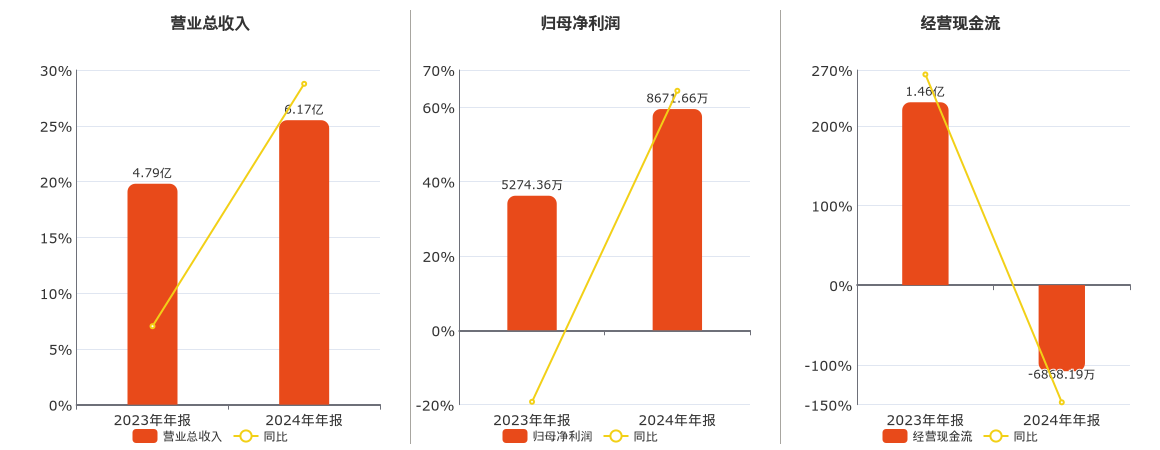 公司营业总收入为6.17亿元。归母净利润为8671.66万元。经营活动现金净流入为-6868.19万元,较去年同报告期经营活动现金净流入减少2.15亿元,同比较去年同期下降147.08%。