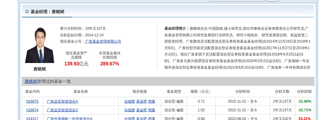 简历显示,唐晓斌先生:中国国籍,硕士研究生,曾任华泰联合证券有限责任公司研究员,广发基金管理有限公司研究发展部行业研究员、研究小组组长、研究发展部总助、权益投资二部投资经理。广发聚优灵活配置混合型证券投资基金基金经理(自2014年12月24日至2018年1月9日)、广发转型升级灵活配置混合型证券投资基金基金经理(自2017年11月27日至2019年1月10日)。现任广发多因子灵活配置混合型证券投资基金基金经理(自2018年6月25日起任职)、广发多元新兴股票型证券投资基金基金经理(自2020年3月2日起任职)、广发瑞锦一年定期开放混合型证券投资基金基金经理(自2021年9月15日起任职)、广发瑞誉一年持有期混合型证券投资基金基金经理(自2022年1月19日起任职)、广发价值领航一年持有期混合型证券投资基金基金经理(自2022年6月2日起任职)、兼任资产管理计划投资经理(自2022年1月6日起)。