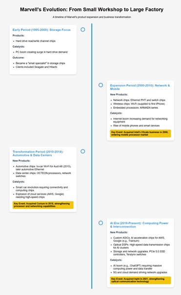 公司创立之际正值1990年代电脑硬盘需求激增。创始人预见到数据将日益重要,而存储是基础,但当时的读写技术速度慢且不稳定,市场上的高端芯片对小公司而言过于昂贵。英特尔等大公司忙于CPU研发,无人专注优化硬盘芯片这一细分领域。因此,迈威尔采用低成本、低功耗的CMOS技术,开发出更快更稳定的读写通道芯片。希捷成为其首个重要客户,迈威尔由此起步,逐步扩展产品线,如下图所示。
