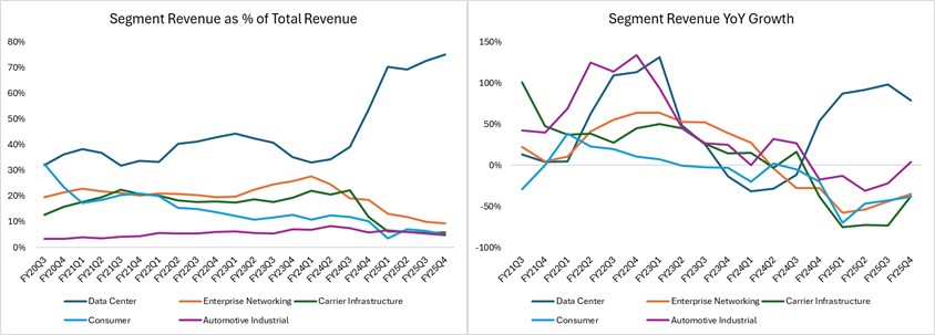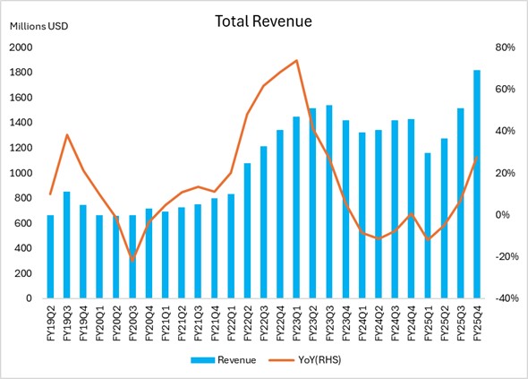 迈威尔科技在2025年第四季度实现营收18.17亿美元,同比增长27%。这一增长主要由数据中心的强劲表现推动,数据中心收入达到13.66亿美元,占总收入的75%,同比增长78%。该增长源自AI基础设施的需求驱动。尽管迈威尔的消费级和运营商基础设施业务出现收入下滑,但数据中心的出色表现弥补了这些损失。