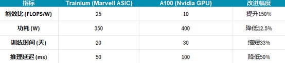 迈威尔科技的定制ASIC是为AI任务量身定制的芯片,技术上采用5nm制程工艺,集成了高带宽内存HBM3。这种设计的核心在于优化AI模型中的矩阵运算,特别是深度学习中的张量计算。相比英伟达的H100等通用GPU相比,迈威尔的ASIC去掉了图形渲染等不必要的功能,将每瓦电力的算力效率提升到极致。下表对比了迈威尔的Trainium与英伟达A100在能效、功耗、训练时间和推理延迟上的表现,展现了其在AI计算中的优势。
