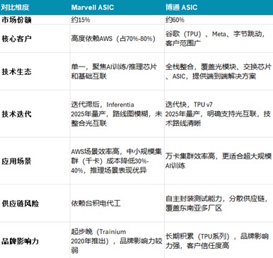 - ASIC芯片优势:Marvell定制ASIC芯片虽在能效方面具有优势,但目前面临市场份额有限(10%-15%)及客户集中度较高的挑战。
