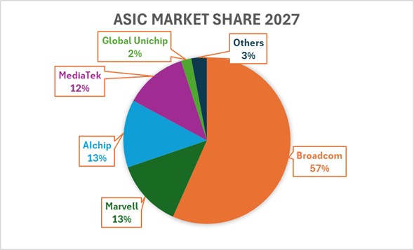 二是越来越多玩家进入ASIC领域,英特尔与Wipro合作加速ASIC设计,英伟达扶持联发科开发ASIC,据广发证券报告,联发科已抢下微软自研芯片订单,取代迈威尔的部分份额,同时据UBS报告,AWS订单调整,原计划2025年下半年推出5nm增强版Trainium,现改为3nm并推迟至2026年下半年,世芯电子可能独家拿下下一代Trainium订单,迈威尔面临更大竞争压力。下图是摩根斯坦利预计的到2027年ASIC市场份额: