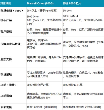 尽管迈威尔的Orion功耗高于博通,但它速度快、支持长距离传输且兼容性良好。迈威尔的Orion更灵活,客户可以自由选择其他厂商的光模块和交换芯片。因此,Orion更受谷歌和Meta等大客户的欢迎,并拥有更大的市场份额。