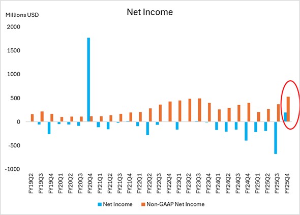 迈威尔在2025年第四季度实现了GAAP净利润2.002亿美元的转正,这主要得益于数据中心业务的强劲增长(注:FY20Q4异常高的净利润是由于Marvell在2019年12月完成了Wi-Fi连接业务的出售,获得了1.7亿美元的现金收入。此外,公司还通过内部资产转让获得了大约7.63亿美元的税收优惠,这对净收入产生了显著的积极影响)。非GAAP净利润达到5.314亿美元,反映了公司在排除一次性费用后核心业务的盈利能力。之前,迈威尔的GAAP净利润一直为负,主要是由于高昂的非运营性费用,如收购摊销和重组费用,Marvell通过收购增强了其在ASIC和数据中心的能力,这些收购虽然带来了短期的财务负担,但长期来看,有助于推动公司在数据中心市场的增长。