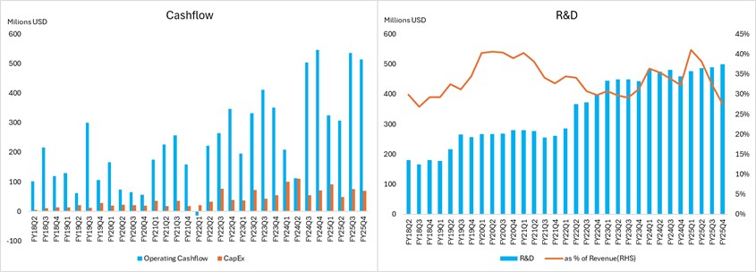 迈威尔的经营性现金流在2025年第四季度为5.14亿美元,全年总计16.8亿美元,财务稳定,能支持研发和股东回报。资本开支(CapEx)的下降可能是由于公司优化了生产效率或调整了扩张计划,可能是因为AWS项目的推迟。