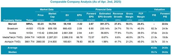 迈威尔当前Forward P/E为22x,基于分析师预测的FY2026 EPS 2.87美元,低于行业平均25x。考虑到订单调整的风险,竞争压力和关税,收入增长可能不及预期,基于此我们下调FY2026预测EPS 10%-20%,Forward P/E升至24.5x-27.5x,所以当前价格接近合理,市场已经入价了这些风险,不过市场仍看好迈威尔的光学DSP及AI ASIC的长期增长潜力,FY2026-2030 EPS预计年均增长20%,未来增长将取决于订单恢复及竞争态势。