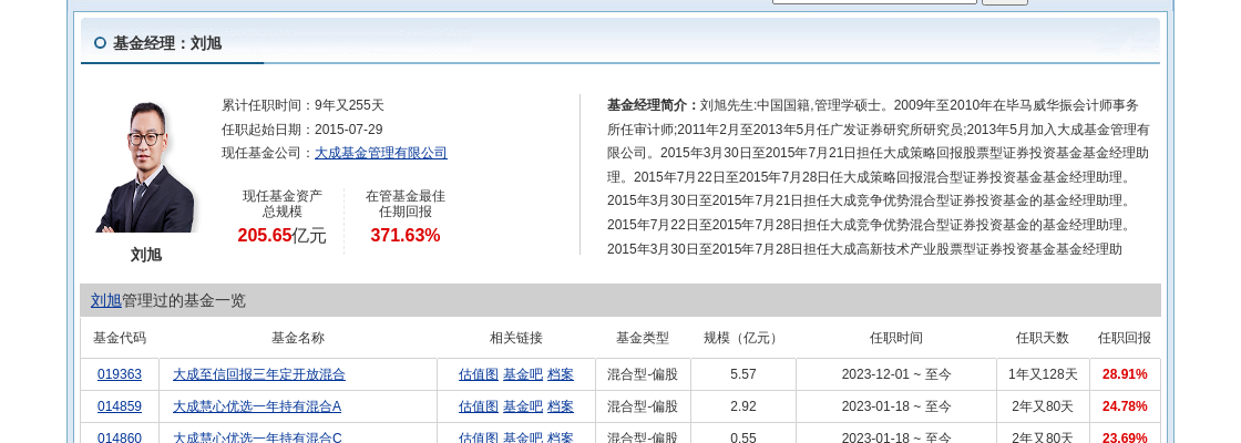 简历显示,刘旭先生:中国国籍,管理学硕士。2009年至2010年在毕马威华振会计师事务所任审计师;2011年2月至2013年5月任广发证券研究所研究员;2013年5月加入大成基金管理有限公司。2015年3月30日至2015年7月21日担任大成策略回报股票型证券投资基金基金经理助理。2015年7月22日至2015年7月28日任大成策略回报混合型证券投资基金基金经理助理。2015年3月30日至2015年7月21日担任大成竞争优势混合型证券投资基金的基金经理助理。2015年7月22日至2015年7月28日担任大成竞争优势混合型证券投资基金的基金经理助理。2015年3月30日至2015年7月28日担任大成高新技术产业股票型证券投资基金基金经理助理,2015年7月29日起任大成高新技术产业股票型证券投资基金基金经理。2016年8月20日至2021年3月17日任大成创新成长混合型证券投资基金(LOF)基金经理。具有基金从业资格。2019年12月24日任职大成优势企业混合型证券投资基金基金经理。2020年6月5日至2024年7月3日任大成睿裕六个月持有期股票型证券投资基金基金经理。2020年8月11日起担任大成睿鑫股票型证券投资基金基金经理。2021年3月15日起任大成核心价值甄选混合型证券投资基金基金经理。2022年6月7日起任大成匠心卓越三年持有期混合型证券投资基金基金经理。2023年1月18日起任大成慧心优选一年持有期混合型证券投资基金基金经理。具有基金从业资格。