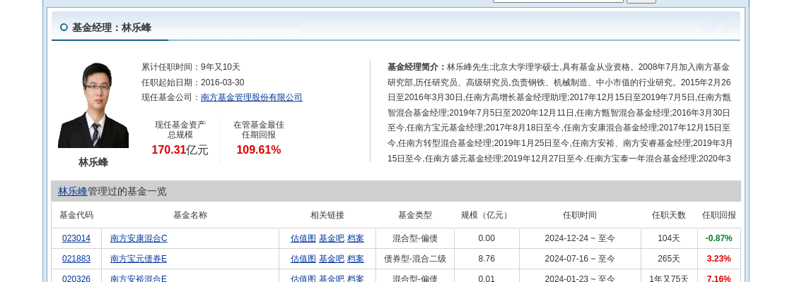 简历显示,林乐峰先生:北京大学理学硕士,具有基金从业资格。2008年7月加入南方基金研究部,历任研究员、高级研究员,负责钢铁、机械制造、中小市值的行业研究。2015年2月26日至2016年3月30日,任南方高增长基金经理助理;2017年12月15日至2019年7月5日,任南方甑智混合基金经理;2019年7月5日至2020年12月11日,任南方甑智混合基金经理;2016年3月30日至今,任南方宝元基金经理;2017年8月18日至今,任南方安康混合基金经理;2017年12月15日至今,任南方转型混合基金经理;2019年1月25日至今,任南方安裕、南方安睿基金经理;2019年3月15日至今,任南方盛元基金经理;2019年12月27日至今,任南方宝泰一年混合基金经理;2020年3月5日至今,任南方宝丰混合基金经理;2021年4月27日至2024年12月27日任南方均衡回报混合基金经理。2021年11月15日至今,兼任投资经理;2022年1月20日至今,任南方宝昌混合基金经理;2022年6月28日至今,任南方宝嘉混合基金经理。2022年9月30日至今,任南方均衡成长混合基金经理。曾任南方盛元红利混合型证券投资基金基金经理。