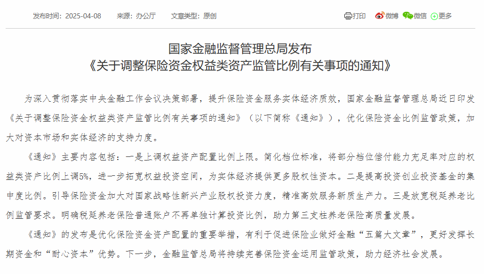 国家金融监督管理总局近日印发《关于调整保险资金权益类资产监管比例有关事项的通知》(以下简称《通知》),优化保险资金比例监管政策,加大对资本市场和实体经济的支持力度。