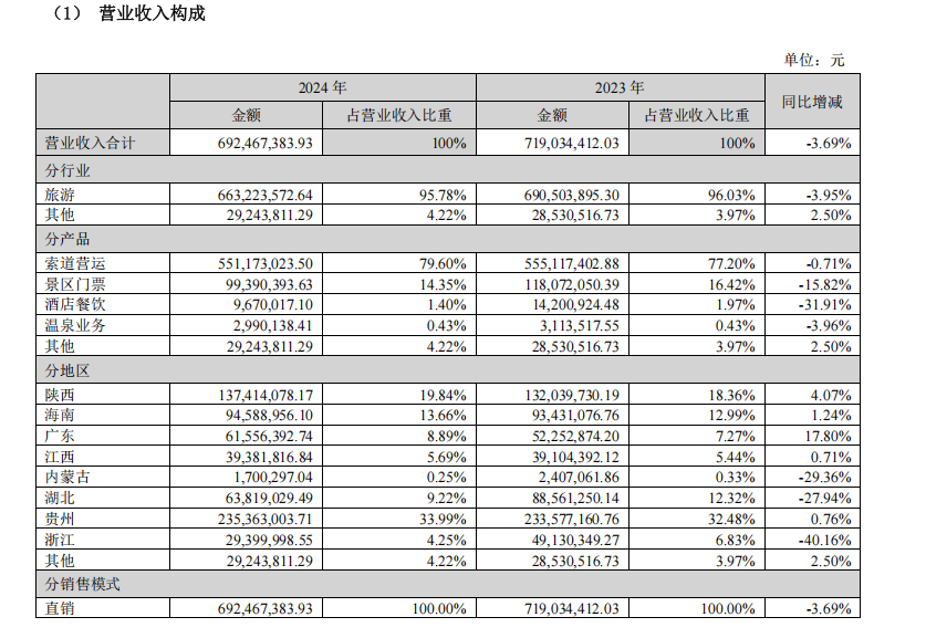 作为营收占比79.6%的核心业务,索道运营在2024年显露出增长乏力迹象。虽然华山索道通过“飞龙在天”网红场景打造实现9.65%的客流量增长,但整体索道收入同比微降0.71%,折射出单一业态的天花板效应。更值得关注的是,景区门票收入同比下降15.82%,酒店餐饮收入锐减31.91%,显示出非索道业务的抗风险能力薄弱。这种“冰火两重天”的业务结构,暴露了过度依赖交通票务收入的商业模式缺陷。