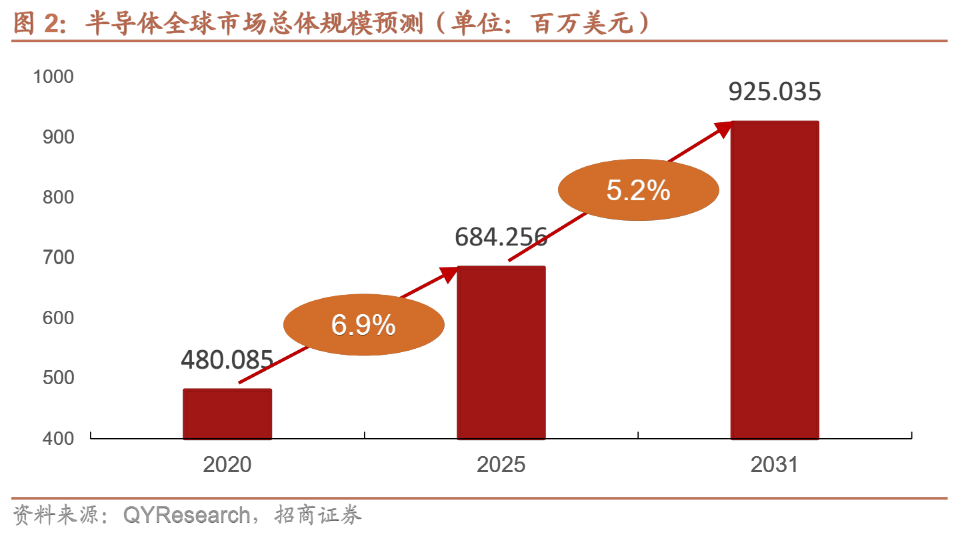 市场空间方面,根据 QYResearch调研团队的最新报告,2020年全球半导体市场规模为4,800.85亿美元,预计 2025、2031 年将分别达到6,842.56亿美元、9,250.35 亿美元,2025年后未来几年年复合增长率 CAGR 为 5.2%。