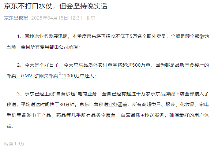 4月15日午间,京东黑板报发布《京东不打口水仗,但会坚持说实话》的文章,疑似回应美团闪购嘲讽。文章称,京东已经上线“自营秒送”电商业务,全国已经有超过十万家京东品牌线下店全部接入了秒送,平均送达时间快于30分钟。京东自营秒送业务涵盖:所有商超类目、服装、化妆品、家电手机等各类电子产品、药品等几乎所有品类全覆盖,自营品质 秒送服务,确保最好的用户体验。