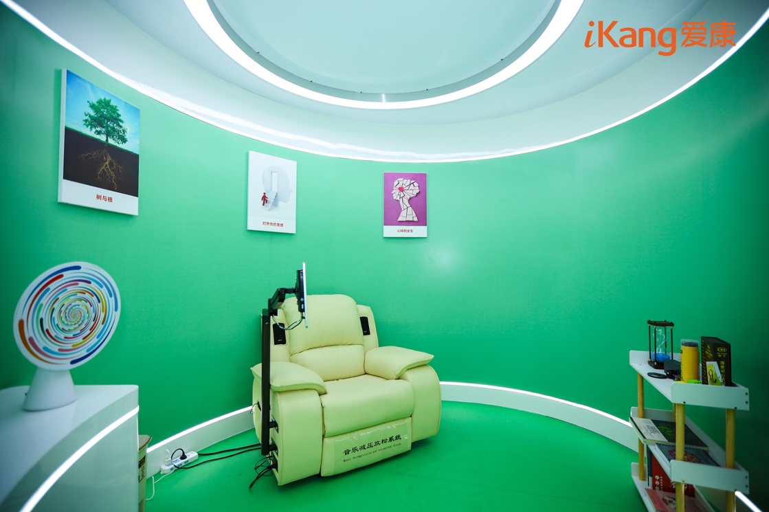 对于高压下的职场人,白天易犯困、晚上难入睡是不少职场人的真实写照,智能冥想头环可缓解焦虑并提升专注力,脑机智能安睡仪则能进行睡眠监测并改善睡眠质量,一旁房间内的体感音乐放松椅也引起观众兴趣,音乐和按摩结合的形式为职场人打造了一处放松身心的港湾。