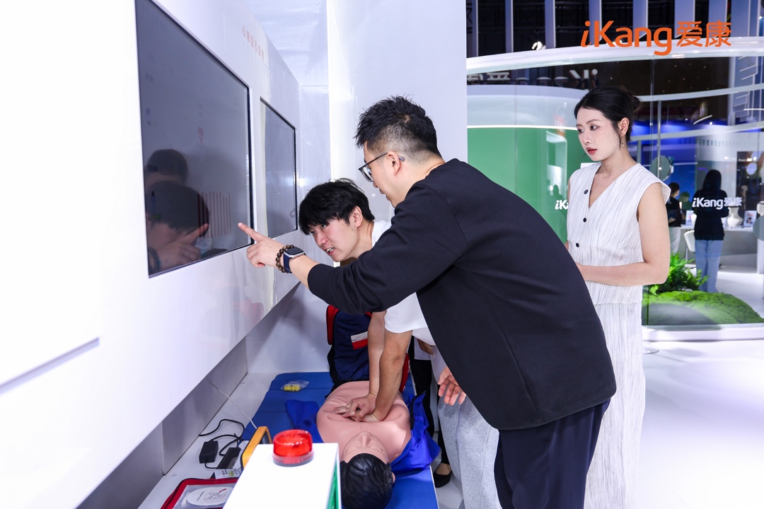 此外,现场还展示了AED除颤器、呼吸器、急救箱、海姆立克训练马甲等综合职场急救设备,观众还在专业医师的指导下沉浸式学习了心肺复苏术、海姆立克急救法等急救技能。
