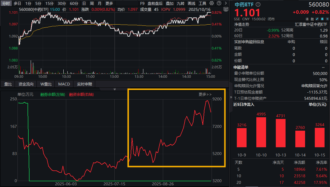 杠杆资金方面,融资客继续借道ETF布局“性价比”更高的中药大消费板块,仍以中药ETF(560080)为例,基金最新融资余额超8200万元,融资余额保持历史高位!(截至2025.10.15,来源:上交所)