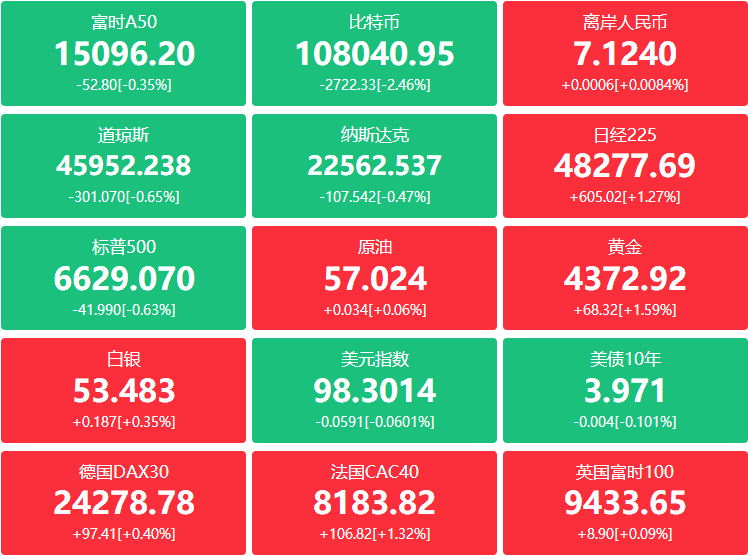 外汇:美元兑日元跌0.43%报150.41日元,欧元兑日元跌0.07%,英镑兑日元跌0.17%,欧元兑美元涨0.39%,英镑兑美元涨0.25%,美元兑瑞郎跌0.49%,澳元兑美元跌0.40%,纽元兑美元涨0.03%,美元兑加元涨0.06%;离岸人民币兑美元报7.1249元,较周三涨49点;比特币跌3.10%逼近10.8万美元;以太币跌3.40%报3860美元。