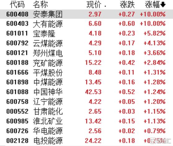 10月17日,煤炭板块再次成为市场焦点。大有能源6天5板,宝泰隆涨5.82%,云煤能源涨4.13%,郑州煤电涨3.66%,兖矿能源、平煤股份、中煤能源、辽宁能源等纷纷上涨。