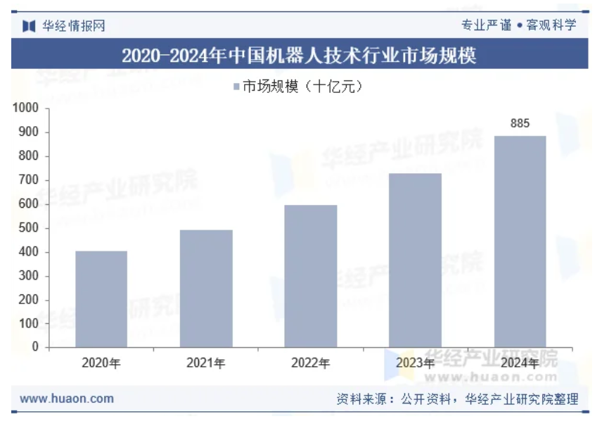 值得注意的是,2024年,中国机器人技术市场规模攀升至8850亿元,展现出蓬勃的活力,2020-2024年这一阶段,市场以21.7%的复合年增长率稳健上扬,机器人产业的市场规模巨大。