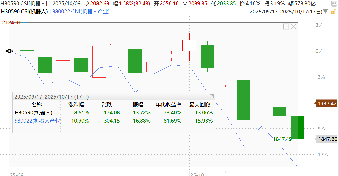 像最近行情回调,其实覆盖全产业链的中证机器人指数要比另一个国证机器人指数(人形含量高)的跌幅小很多。