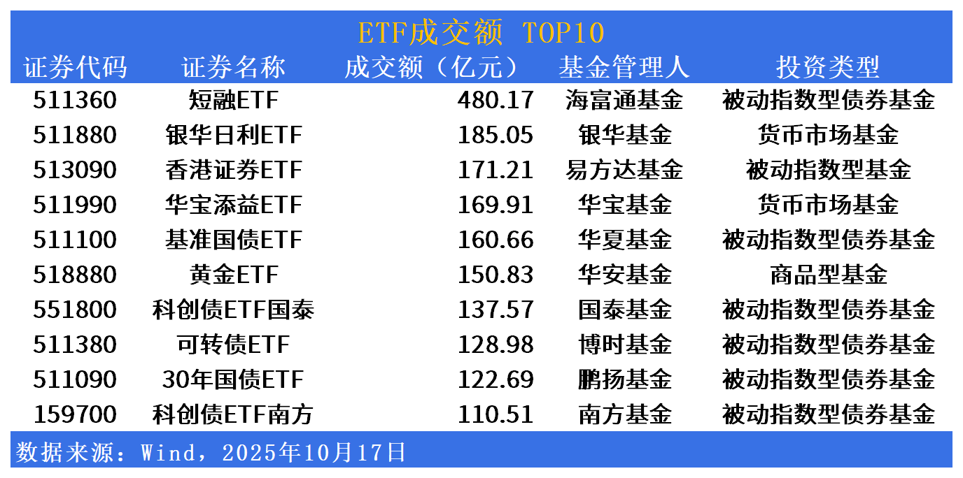 成交额方面,短融ETF(511360)今日成交额居首,达480亿元;银华日利ETF(511880)、香港证券ETF(513090)、华宝添益ETF(511990)成交额紧随其后。