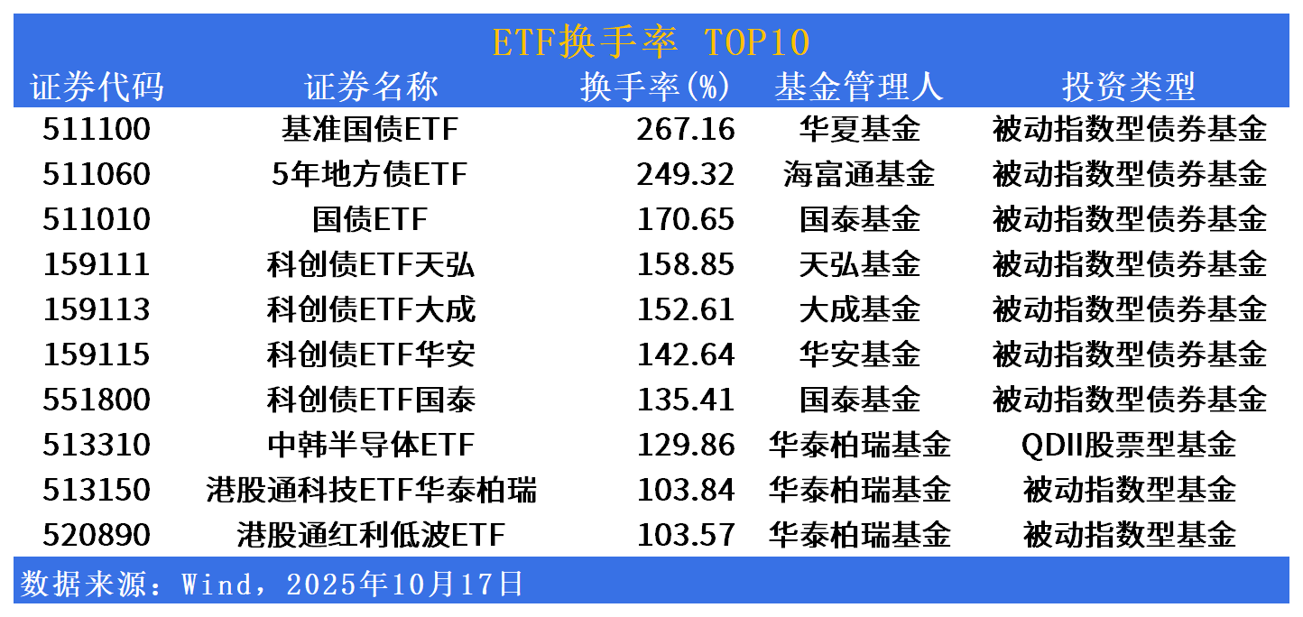 换手率方面,基准国债ETF(511100)换手率居首,达267%。5年地方债ETF(511060)、国债ETF(511010)、科创债ETF天弘(159111)换手率居前。
