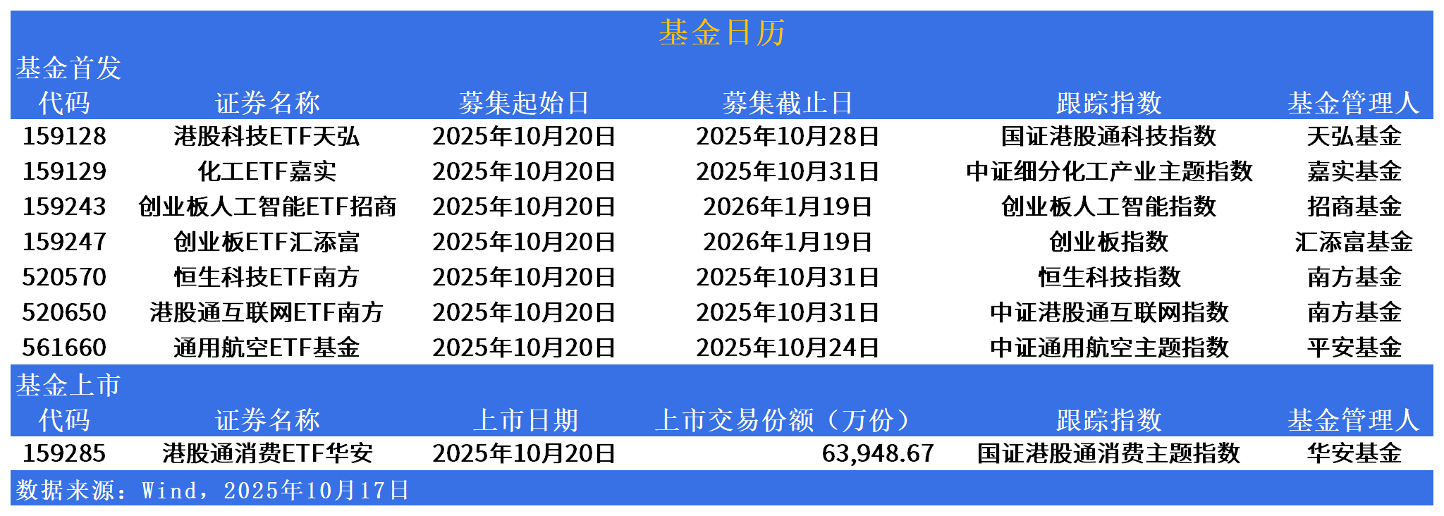 具体来看,下周一有7只产品开始募集:港股科技ETF天弘(159128)、化工ETF嘉实(159129)、创业板人工智能ETF招商(159243)、创业板ETF汇添富(159247)、恒生科技ETF南方(520570)、港股通互联网ETF南方(520650)、通用航空ETF基金(561660),分别跟踪国证港股通科技指数、中证细分化工产业主题指数、创业板人工智能指数、创业板指数、恒生科技指数、中证港股通互联网指数、中证通用航空主题指数。