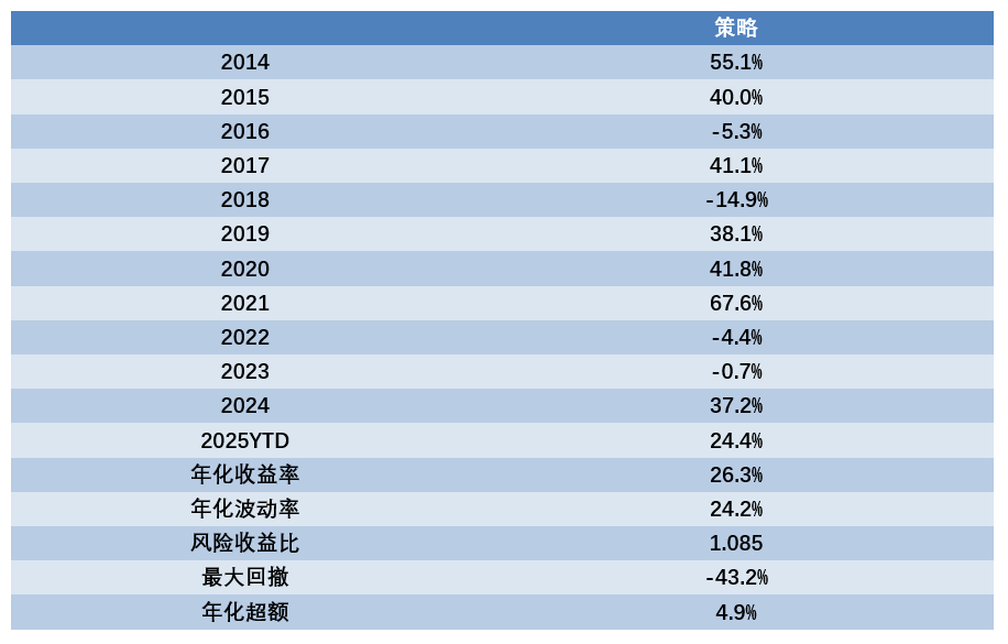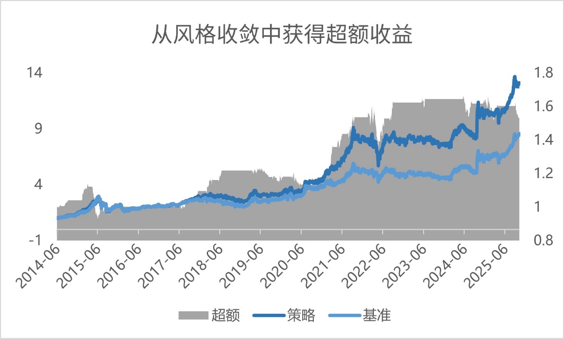 为抓住风格收敛带来的超额收益,我们做了相应的策略,当风格分歧达90%或10%分位(历史极值)时,全仓配置相对成长100与价值100中欠涨指数;待收益分歧回落至50%分位(历史中枢),再重新等权配置两指数(基准为始终等权配置两个指数)。