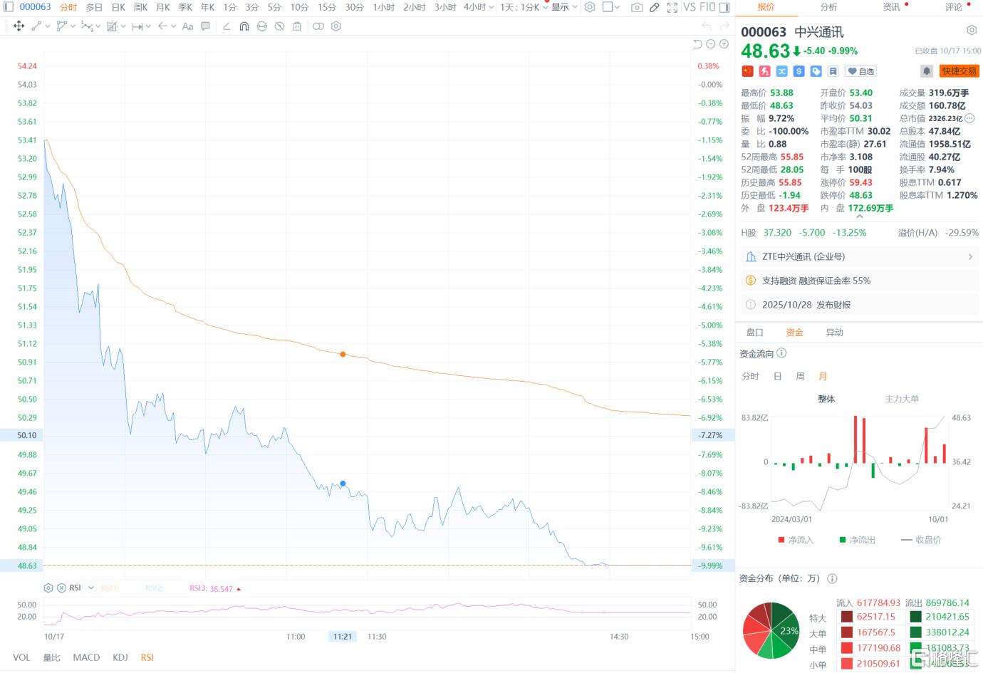 其中,A股中兴通讯跌停,最新市值2326.23亿元;H股跌超12%报37.48港元,总市值1792.87亿港元。