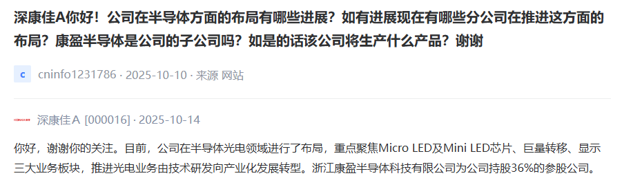 近日,深康佳A(000016.SZ)在互动平台回应投资者提问时表示,目前公司在半导体光电领域进行了布局,重点聚焦Micro LED及Mini LED芯片、巨量转移、显示三大业务板块,推进光电业务由技术研发向产业化发展转型。这一表态再次彰显了公司深耕半导体领域的战略定力。